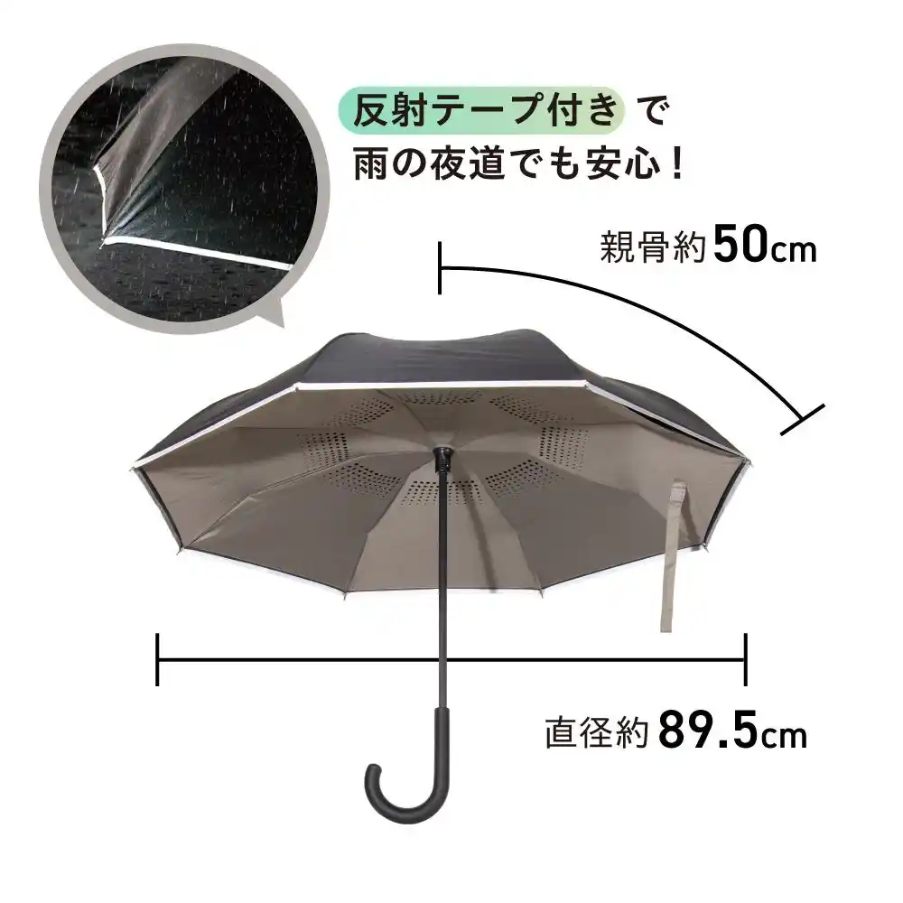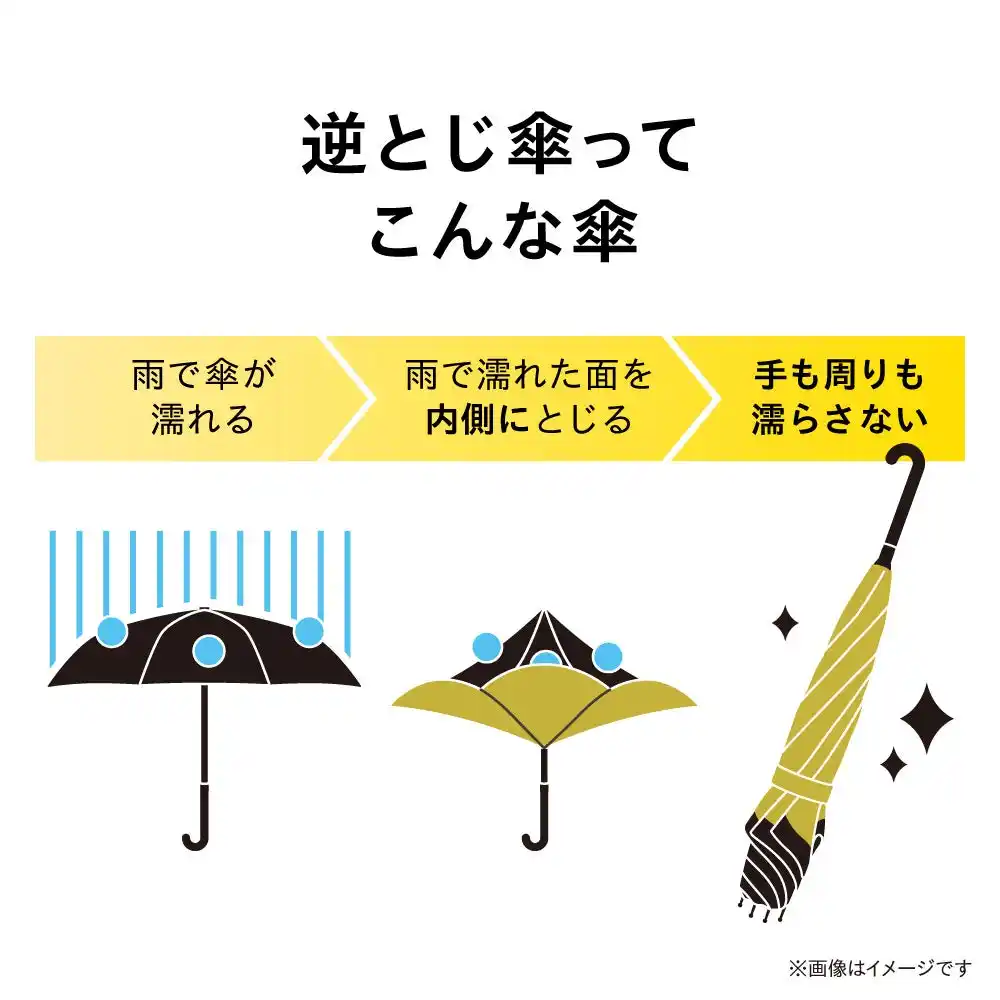 | 本製品は、傘をたたむと雨に濡れた面が内側に収まる構造の逆とじ傘です。満員電車で周りの人を濡らしてしまう心配や、自動車に乗り込む際にシートを濡らしてしまう心配も減ります。 | ||||||||||||||