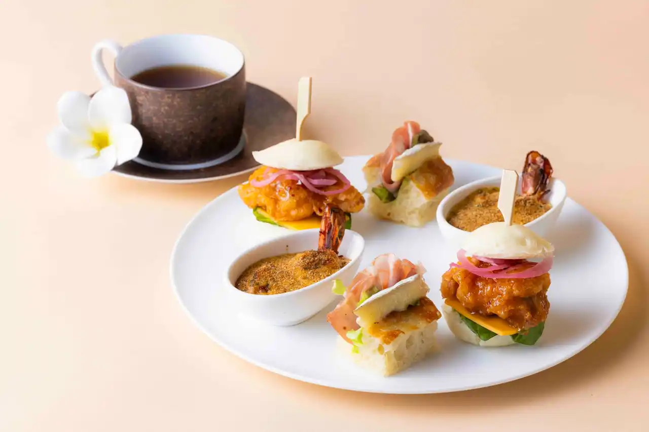 写真左から反時計回りに)海老のプランチャ ハーブマヨネーズ、ブリーとモルタデッラのチャバタサンド、クリスピーチキンのバオサンド ホットハニーソース |