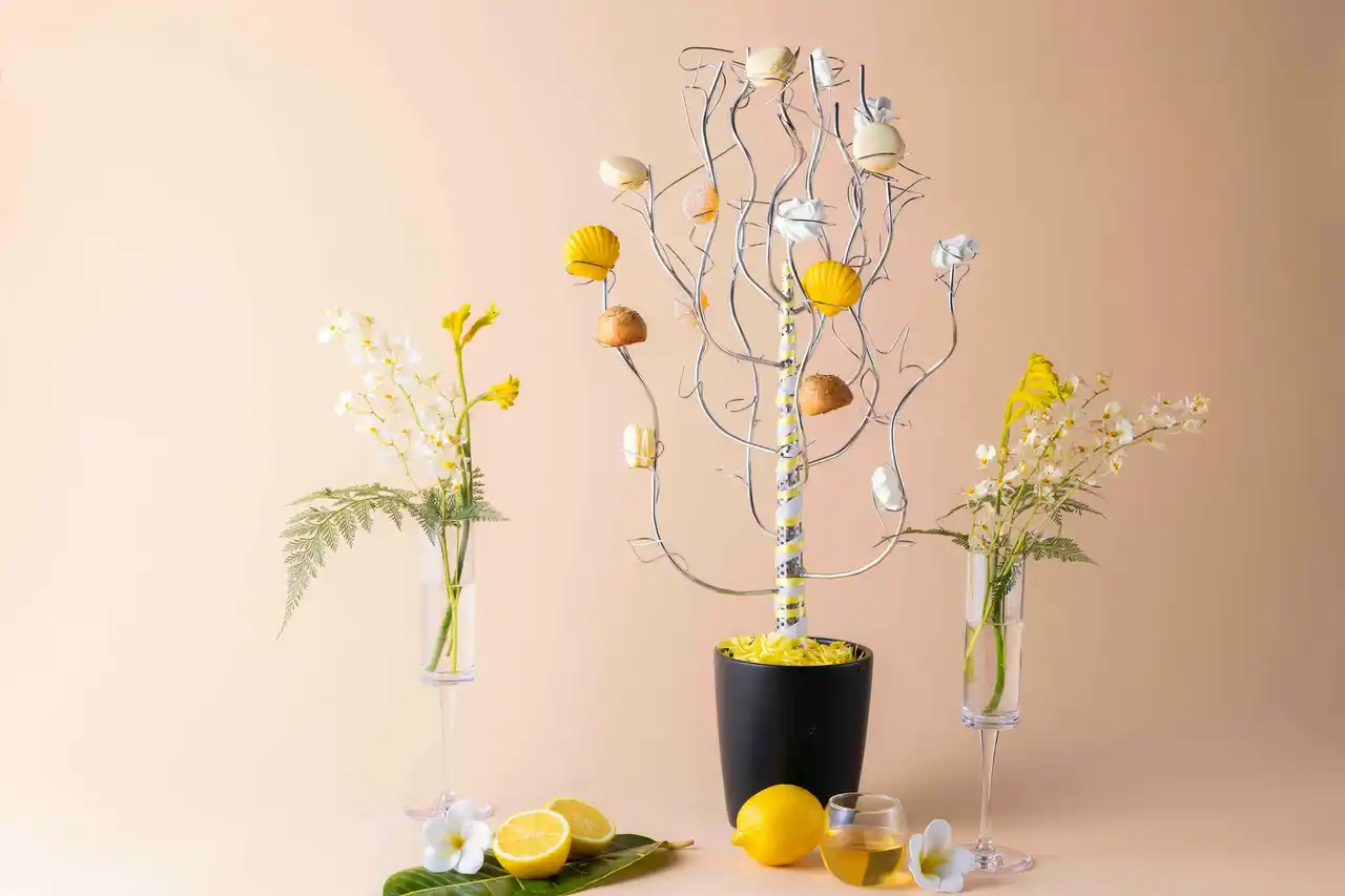 センタラグランドホテル大阪のシグネチャーである「プティフールツリー」には、大阪産はちみつを使用したフレンチミニャルディーズをご用意しました。 |