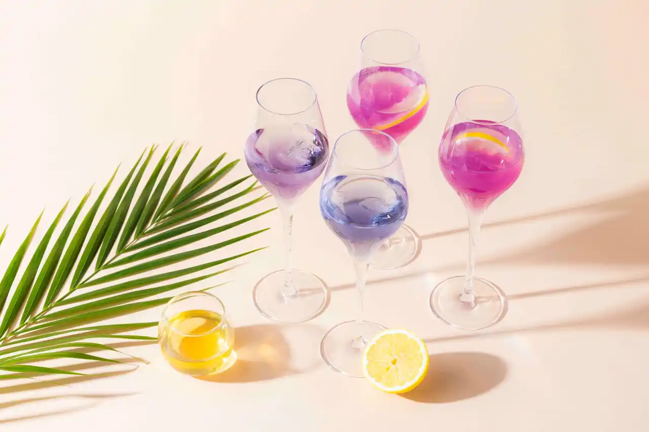 タイで親しまれているバタフライピーティーを使用、色が変わるウェルカムドリンク |