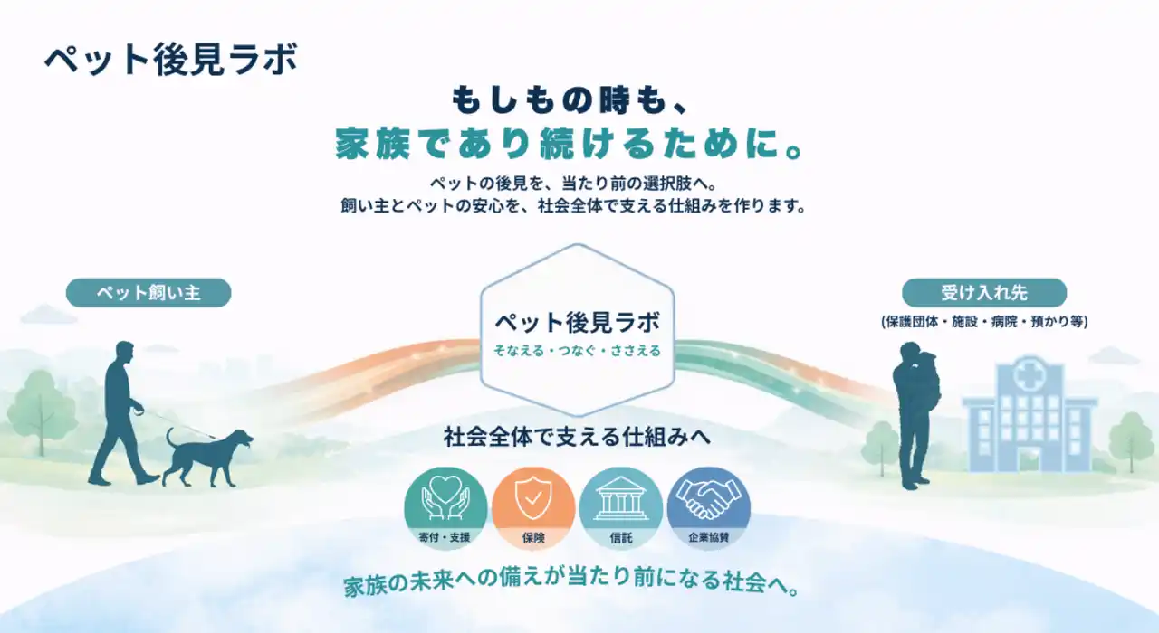 ペット後見ラボは、「ペットの未来を守る仕組みを社会に実装する」 ことを目的に、ペット関連企業・専門家・NPOが連携し、啓発・研究・制度設計・事業共創を行う業界横断型の共創プラットフォームです。公式サイトでは、ペット後見の基礎知識、事例、企業向けの参画方法などを公開し、業界全体での共創を促進しています。 |