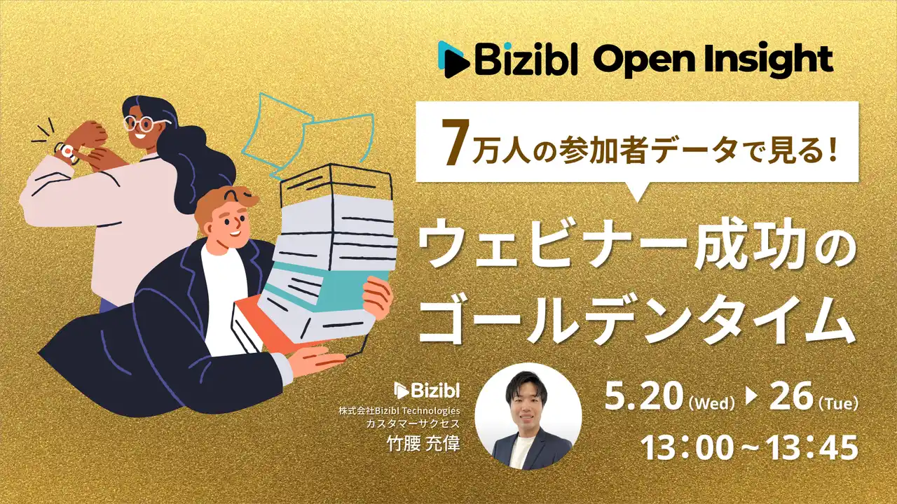 ウェビナーマーケティングツール「Bizibl(ビジブル)」を提供する株式会社Bizibl Technologies(本社:東京都千代田区、代表取締役:花谷 燿平、以下 Bizibl)は、曜日・時間帯・ターゲット別に見るウェビナー開催戦略をテーマとしたウェビナー「7万人の参加者データで見る!ウェビナー成功のゴールデンタイム」を、2026年5月20日(水)から5月26日(火)までの期間、Bizibl上にて開催いたします。 |