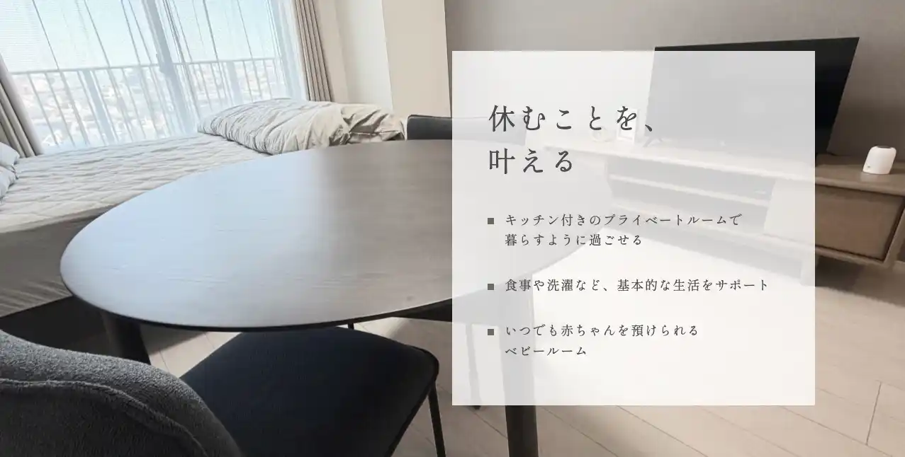 プライバシーを守り日常に近い完全個室、栄養バランスの取れた食事サポート、24時間体制の助産師による親子のケア。コンパクトではありますが、産前産後の「困った」の多くを解決できる場所になれると信じています。まずは8月までの実証期間ではありますが、多くの方に活用いただき、このようなセーフティネットが広く届く社会をつくっていきたいと思います。 |