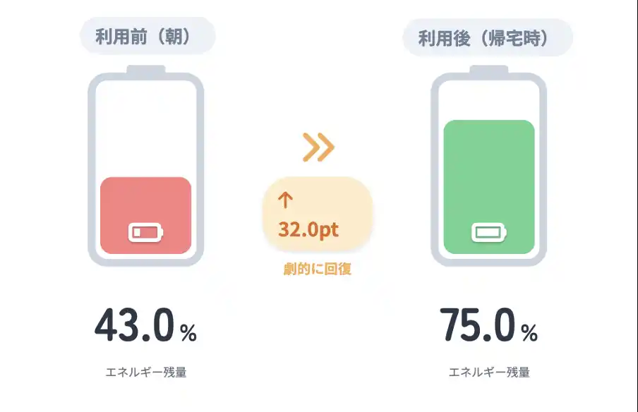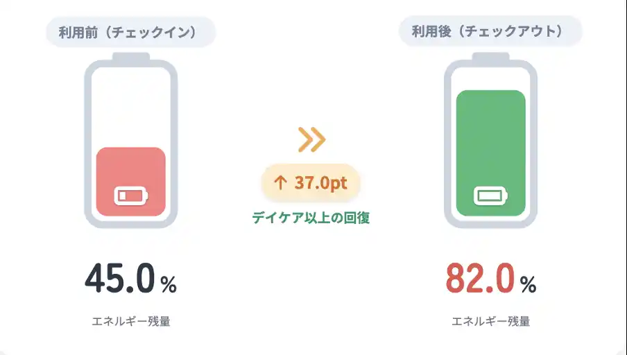 なお、先行して開始したプレオープンでは50組以上が体験し、利用者アンケートでは「入居前時点のエネルギー残量」と「帰宅時点のエネルギー残量」を自己申告で回答いただいた結果、デイケア体験では平均43%→75%、宿泊体験では平均45→82%へと回復する傾向※2が見られ、コンパクトな中にも十分な提供価値があることが分かりました。 |