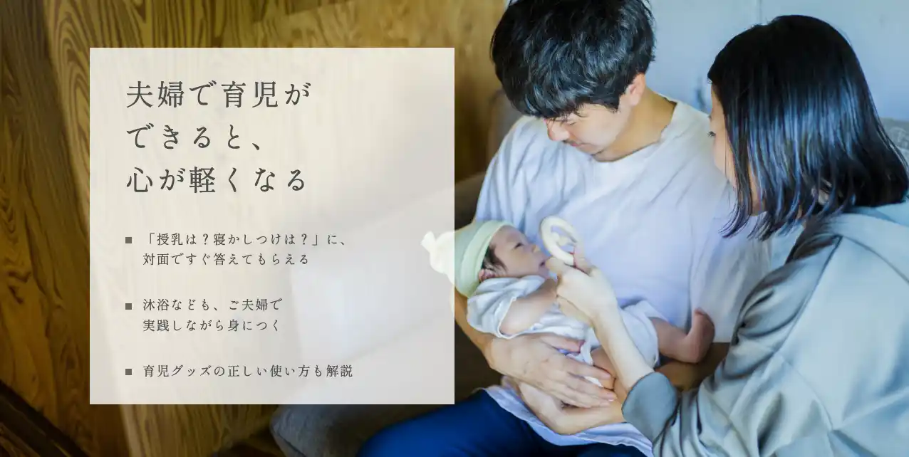 滞在だけで終わらせず、退去後もJicca Nakanoの助産師にオンラインで相談できる導線を用意。産後の体調の変化や赤ちゃんの肌の状態のケア、育児に関する質問など、“揺り戻し”が起こりやすい時期の安心を支えます。 |