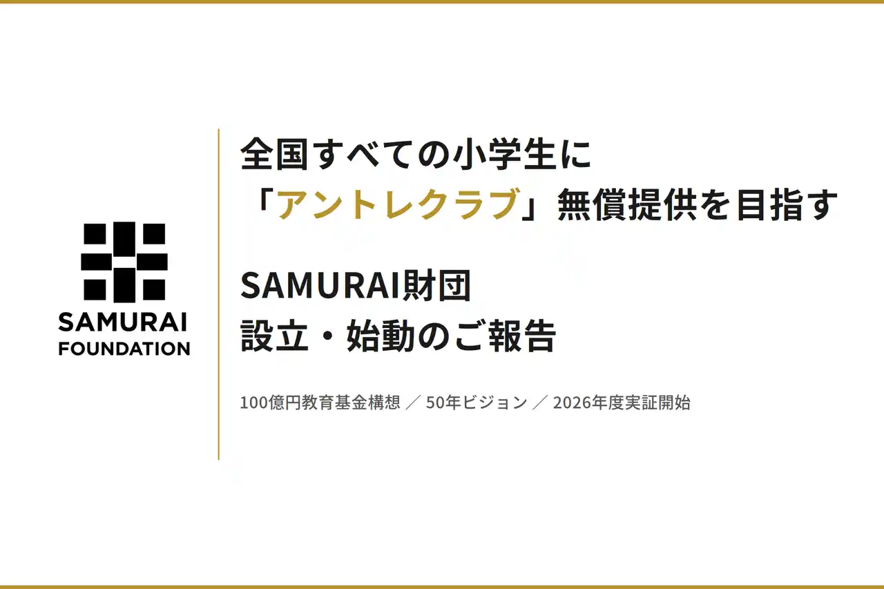 当財団は「できるできないでなく、やるかやらないかで世界を変える」をミッションに、全国すべての小学生に「SAMURAIアントレクラブ」を提供する50年ビジョンを発表します。小学5・6年生を対象とした課外型の起業教育プログラムを通じて、挑戦・協働・創造を軸とした次世代の人材育成に取り組みます。すべての小学生に無償で提供する教育インフラの構築を目指すものです。 2026年度より、まずは4~6の小学校・エリアと提携し、パイロット版の提供と実証を開始します。 |