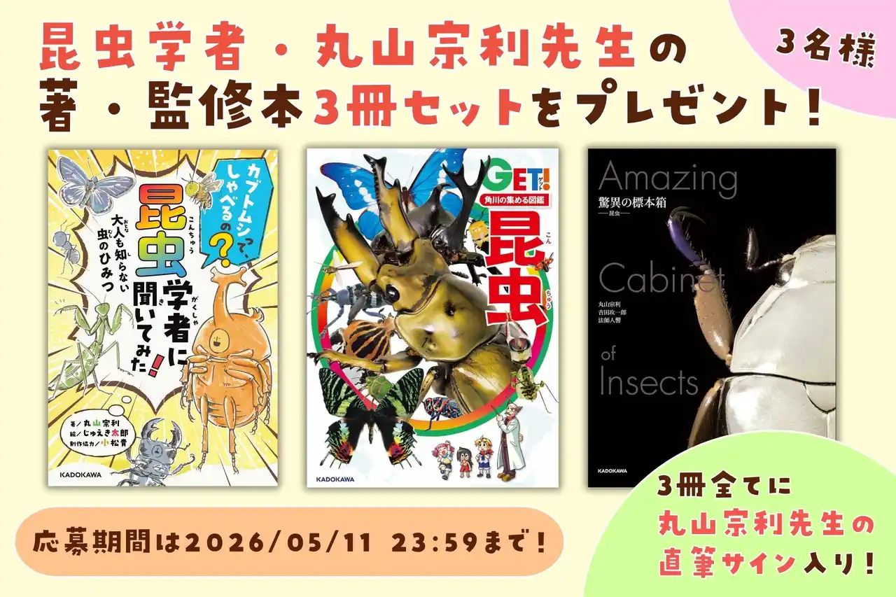株式会社KADOKAWAは、2026年3月26日(木)発売の最新刊『カブトムシって、しゃべるの? 昆虫学者に聞いてみた! 大人も知らない虫のひみつ』(著者:丸山宗利/絵:じゅえき太郎/制作協力:小松貴)の発売を記念し、丸山宗利先生の直筆サイン入り関連書籍3冊セットが抽選で3名様に当たるキャンペーンを、X(旧Twitter)にて実施いたします。
