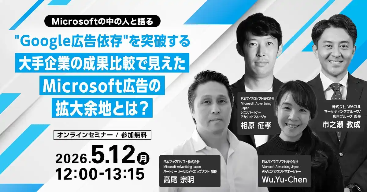 データと知見を核に、戦略から実行までマーケティングDXを一気通貫で支援する株式会社WACUL(本社:東京都千代田区、代表取締役社長:大淵 亮平、読み:ワカル、以下当社)は、5/12(月)にオンラインセミナー【Microsoftの中の人と語る!"Google広告依存"を突破する 大手企業の成果比較で見えたMicrosoft広告の拡大余地とは?】を開催いたします。 |