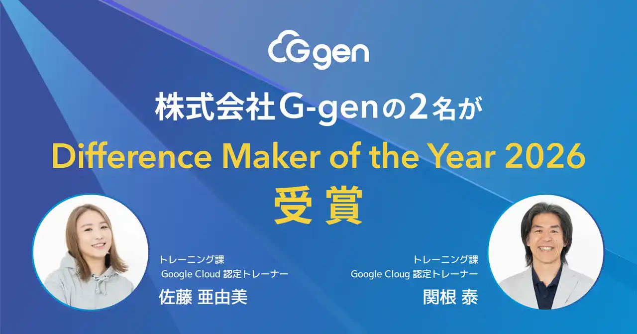 | 株式会社G-gen(本社:東京都新宿区、代表取締役:羽柴 孝、以下 G-gen)は、このたび Cloud Learning Services Award において、弊社 Google Cloud 認定トレーナーの関根 泰と佐藤 亜由美 が「Difference Maker of the Year 2026」を受賞したことをお知らせいたします。 | |||