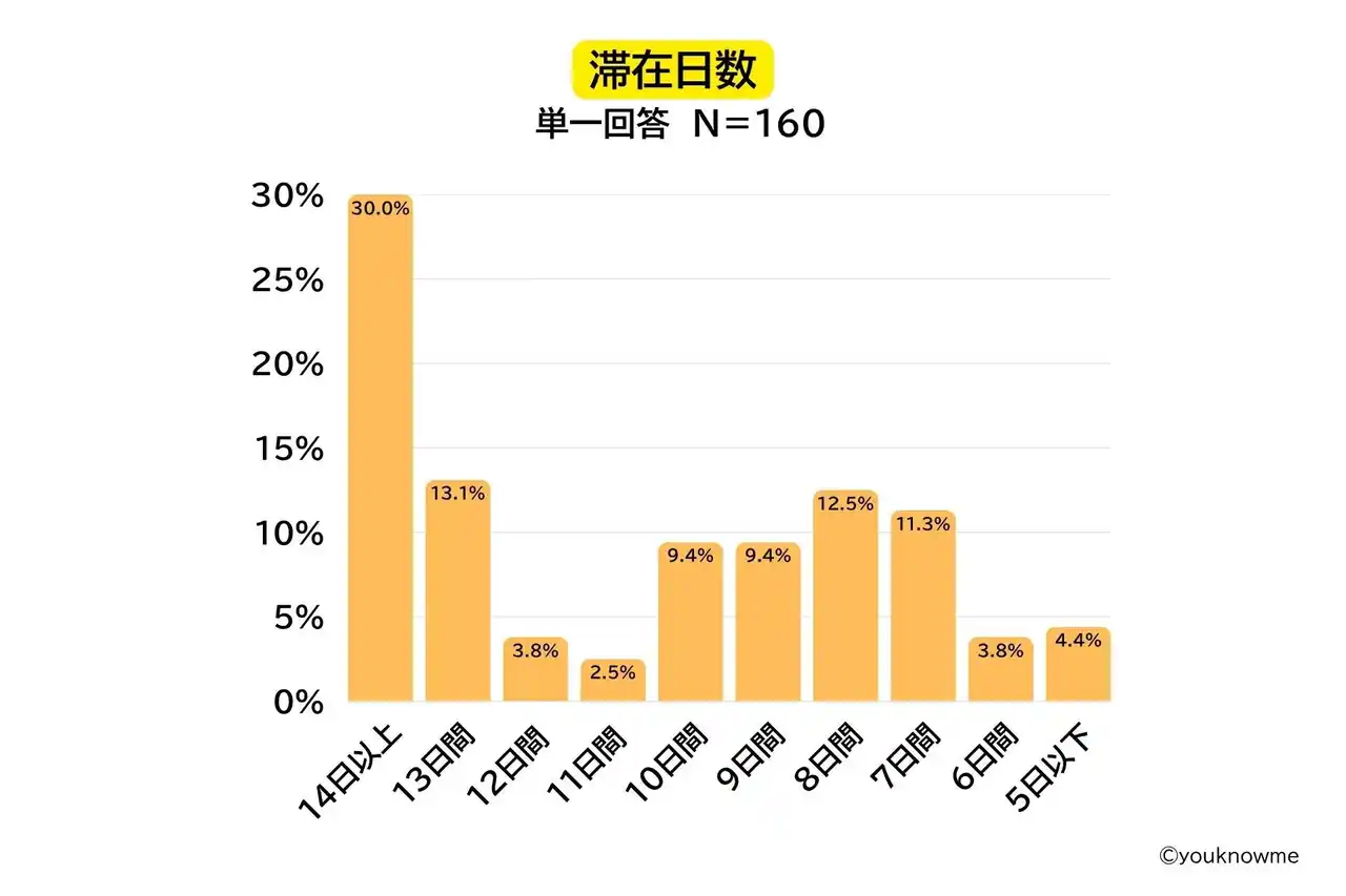 また、滞在日数を聞いてみると「14日以上」が30.0%と最も多く、7日以上の滞在の合計が全体の約9割と、全体的に長期滞在の傾向が強い結果となりました。 |