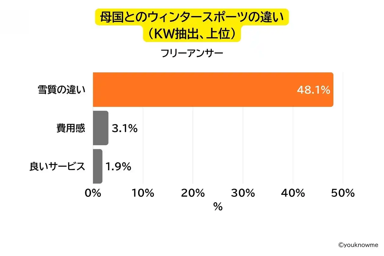 また、母国とのウィンタースポーツの違いを問う設問(フリーアンサー)においても、「Snow quality(香港、30代女性)」、「Great snow, food, friendly people.(アメリカ、30代女性)」と具体的に雪質に関するコメントが多数寄せられる結果となりました。 |