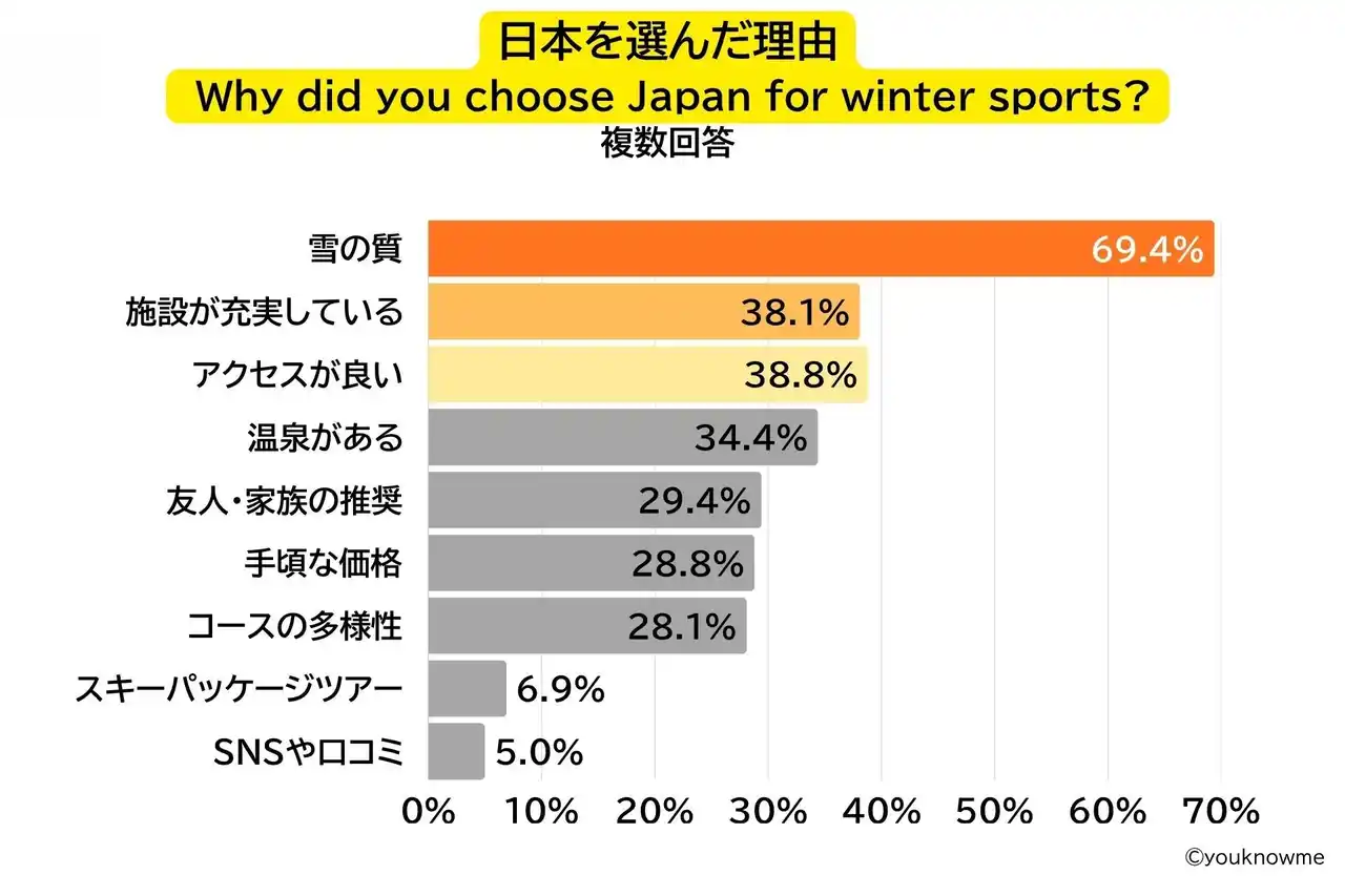 ウィンタースポーツのための旅行先として日本を選んだ理由を問う設問では、「雪の質」が69.4%と最多の回答となり、2位以下を大きく引き離しています。 |