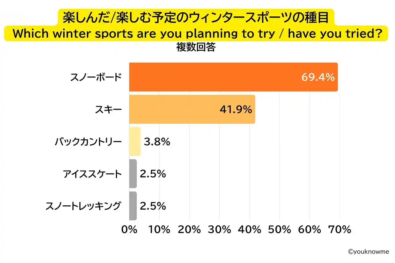 既に楽しんだ、もしくはこれから楽しむウィンタースポーツの種目を問う設問では、「スノーボード(69.4%)」が最も多く、次いで「スキー(41.9%)」という結果になりました。この他、少数ではあるものの、アイススケートやバックカントリー、スノートレッキングという回答もありました。 |