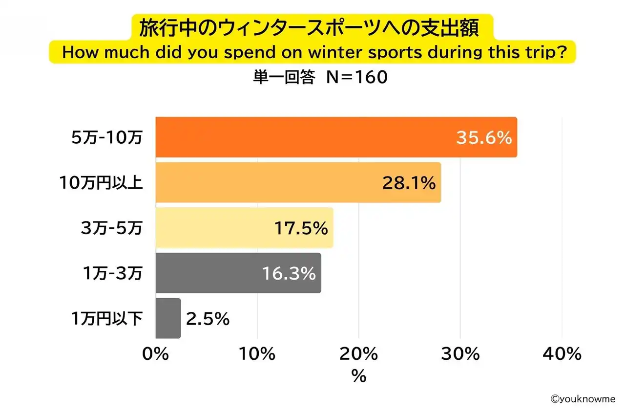 日本のパウダースノーは“JAPOW”と呼ばれ、既にその魅力は世界中の人に知られていますが、東京から新幹線でアクセスの良いエリアを押さえ北海道のニセコが2位にランクインしていること、また、5万円以上の金額をかける人が全体の6割以上ということからも、ウィンタースポーツ好きな外国人観光客にとっては、日本のパウダースノーは来日の大きな動機付けになっていると言えるでしょう。 |