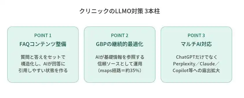 ※本調査の全体数値(121院ベース)からは、当社がLLMO対策を実施している2院を除外し、対策未実施の母集団として集計しています。また「4. LLMO対策実施クリニックの事例」の当該クリニックは仮称で記載しています。 |