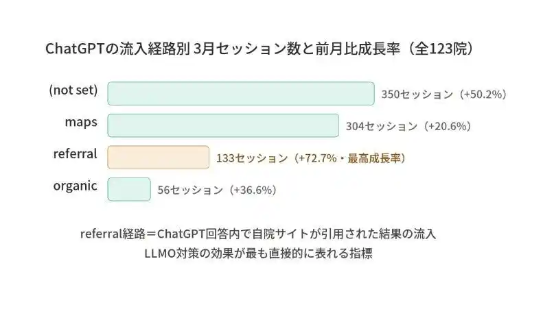 また、referral経路(AI回答内でクリニックのWebサイトが引用・参照された結果の流入)は前月比+72.7%と最高成長率を記録しており、AIへの引用最適化(LLMO対策)の効果が最も直接的に表れる指標と位置付けられます。 |