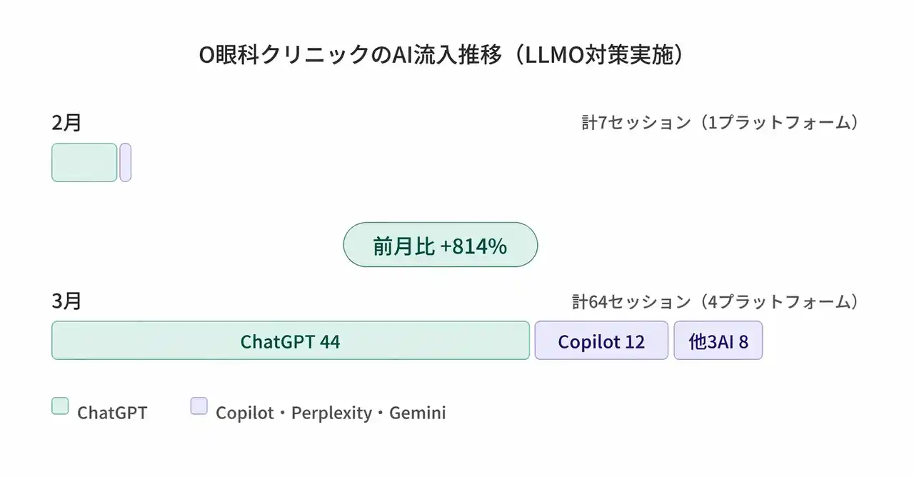 LLMO対策実施クリニック1院では、前月比+814%の成長、1→4プラットフォームへの流入元拡大の事例を確認 |