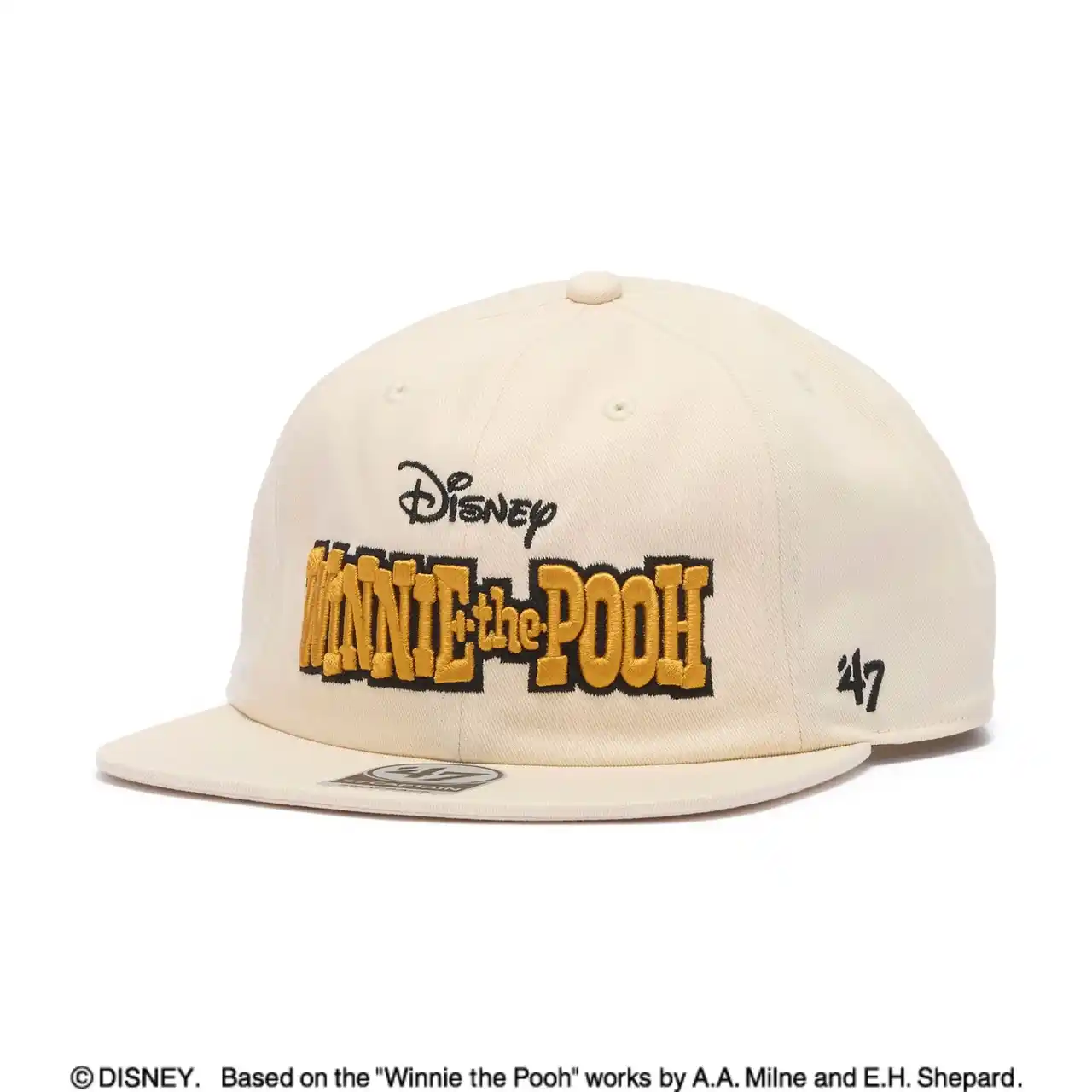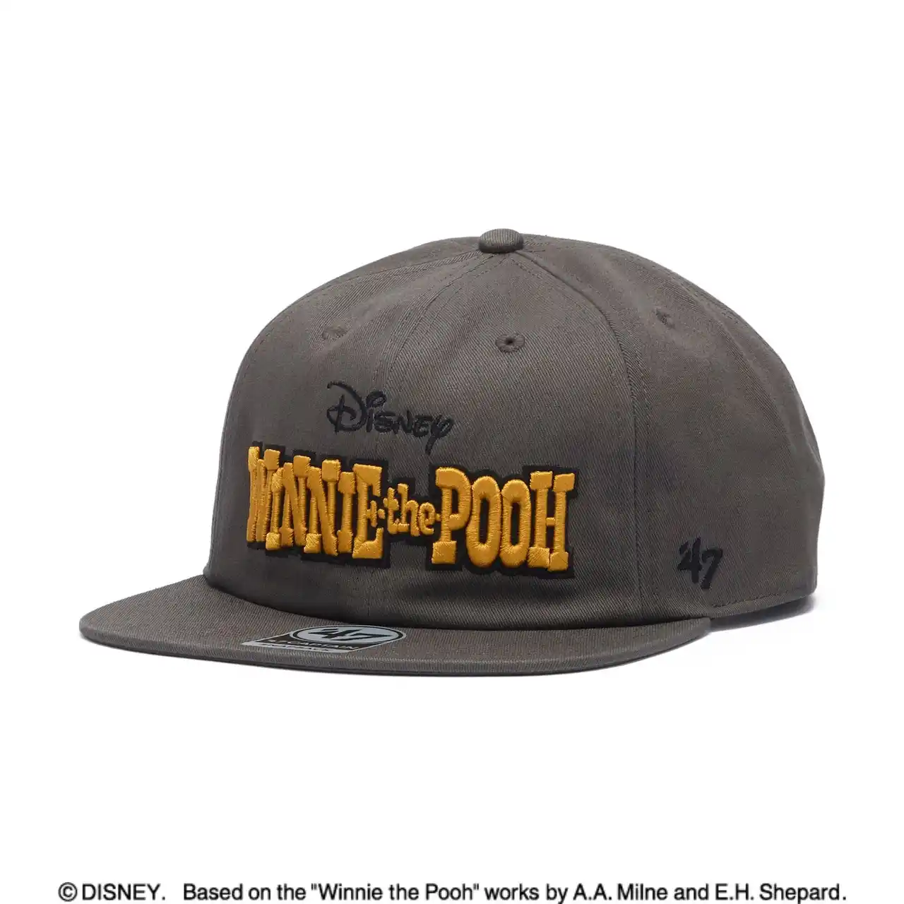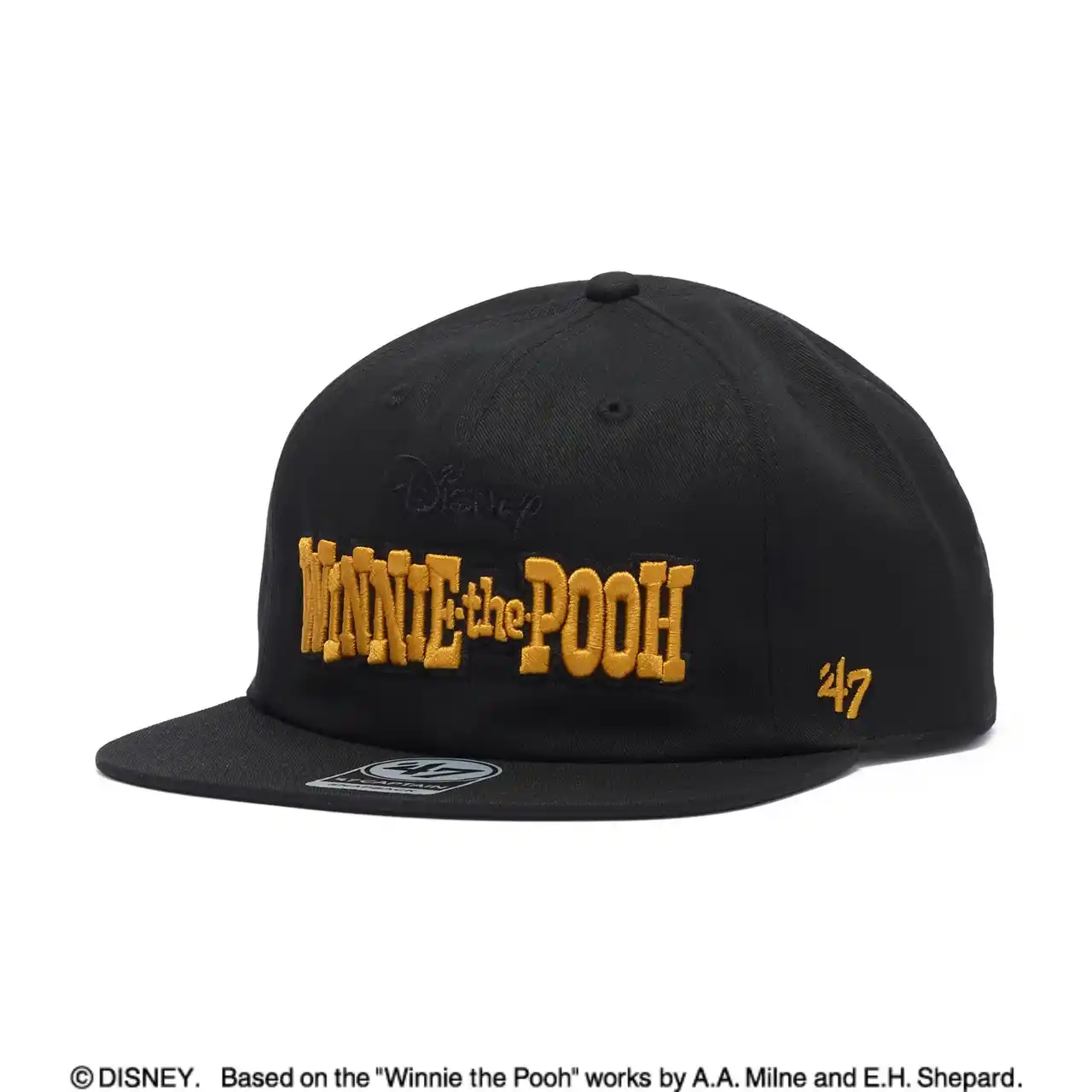 「CAPTAIN」は、四角型のフラットバイザーを採用したアジャスタブル仕様で、フロントパネルとスナップバックによりきれいなシルエットをキープします。フロントには「WINNIE THE POOH」のロゴ刺繍をあしらい、あえてキャラクターを使用しないミニマルなデザインに仕上げました。 |