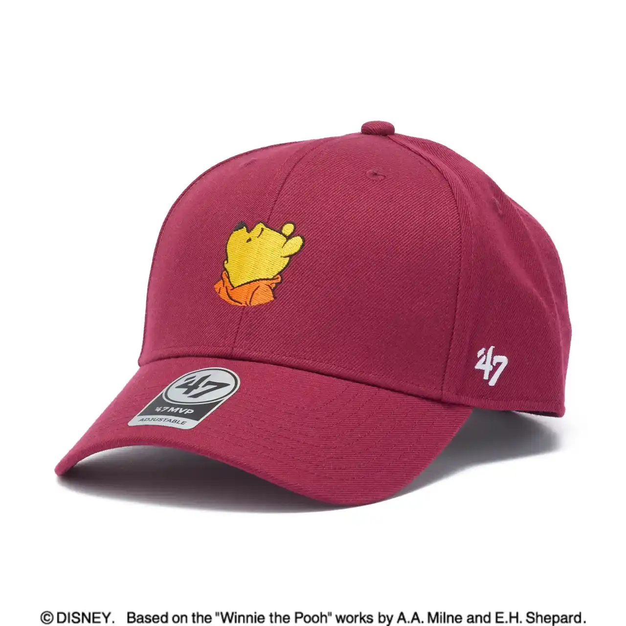 「くまのプーさん」モデルでは、プーさんの表情を刺繍した「MVP」と、ロゴ刺繍を配した「CAPTAIN」を展開します。「MVP」は、フロントパネルを立ち上げたクラシックなシルエットと快適なフィット感が特徴のアジャスタブル仕様で、フロントにプーさんの表情を配したデザインです。 |