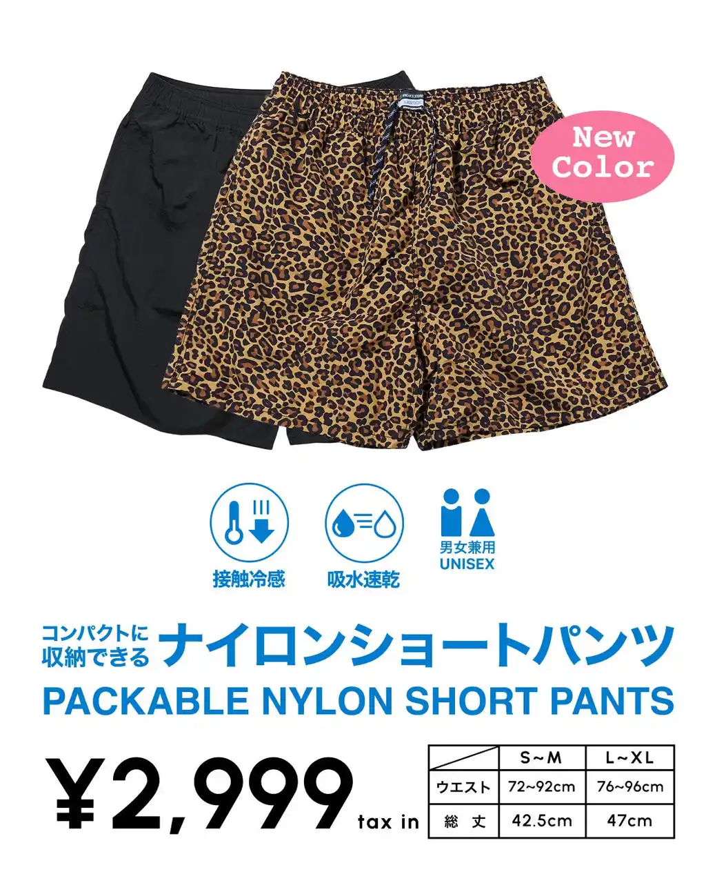 さらに、ショートパンツは新色として個性的なレオパードに!それぞれS~M、L~XLの2サイズ展開です。 |