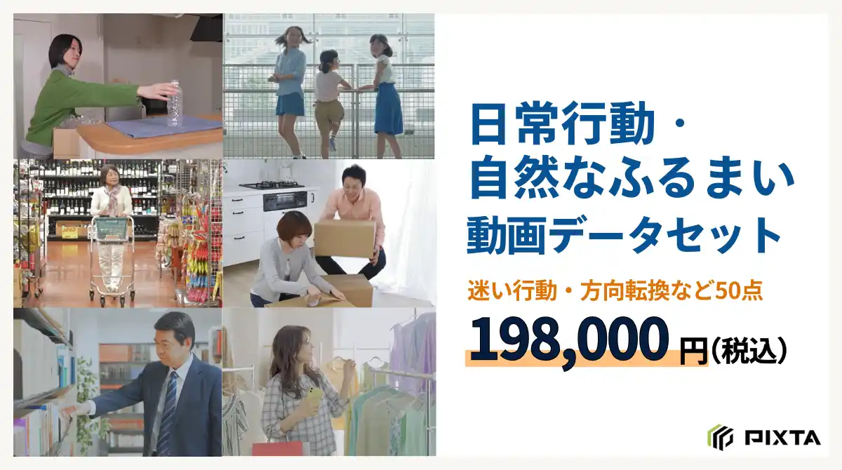 ピクスタ株式会社(東京都渋谷区 代表取締役社長:古俣大介、東証スタンダード:3416)が運営する写真・イラスト・動画・音楽素材のマーケットプレイス「PIXTA(ピクスタ)」は、「機械学習用画像・動画データ提供サービス」として、動画50点・25種類の動作を収録した「日常行動・自然なふるまい動画データセット」を販売いたします。本データセットは、単純な動作の切り出しではなく、実環境における文脈を伴う行動に着目して構成されています。動き出しや停止、方向転換、迷いといった行動の変化に着目した動画を収録しており、行動理解や行動予測といったAI開発に活用しやすいデータセットとなっています。 |