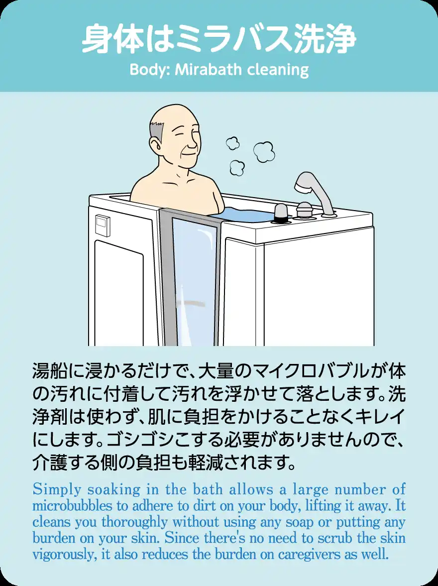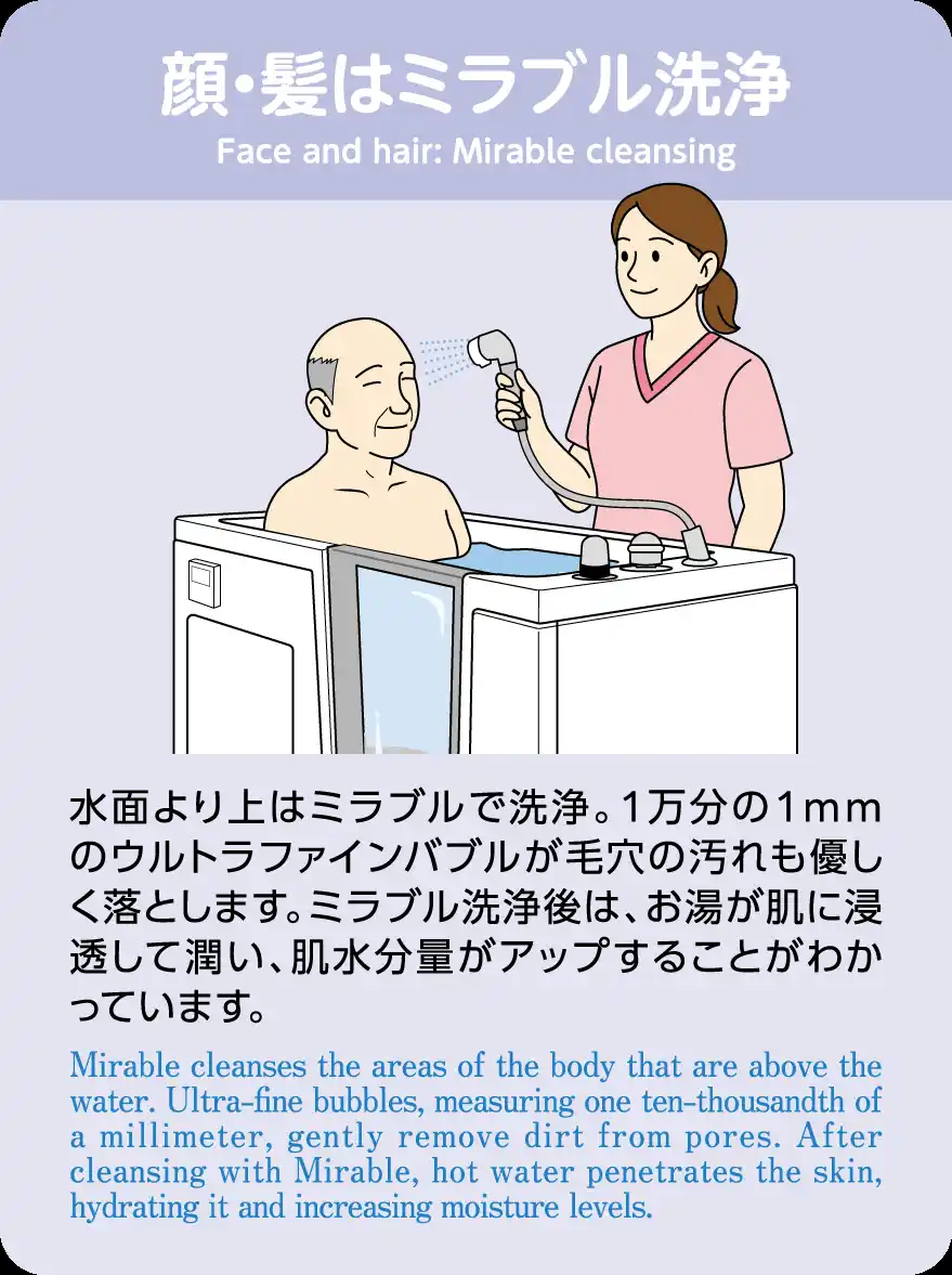 ・お湯に浸かっていない顔や髪などには、シャワーヘッド「ミラブル」によって洗浄。 |