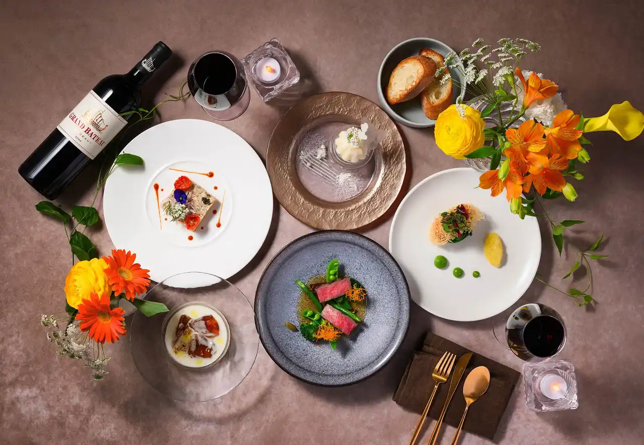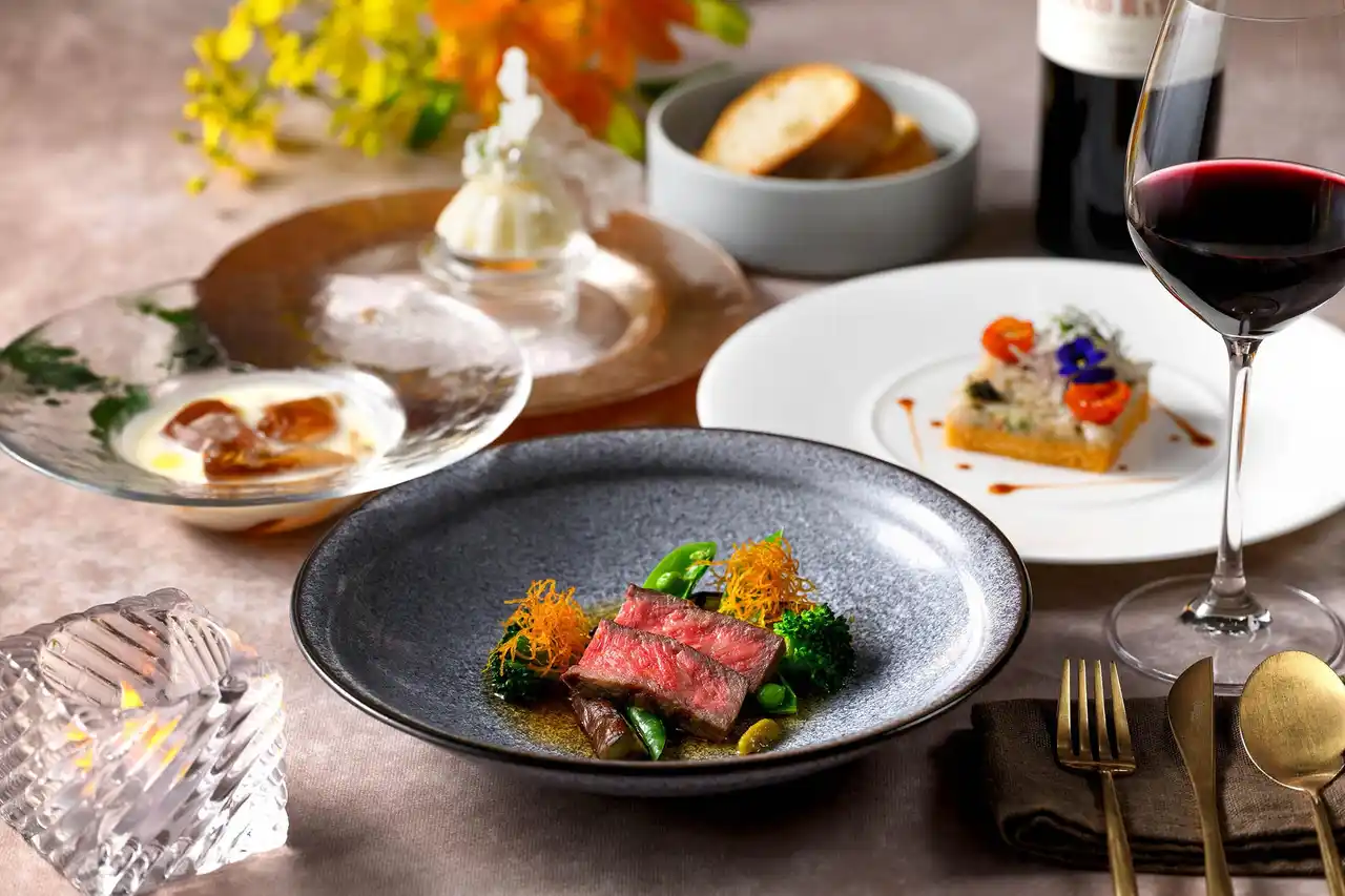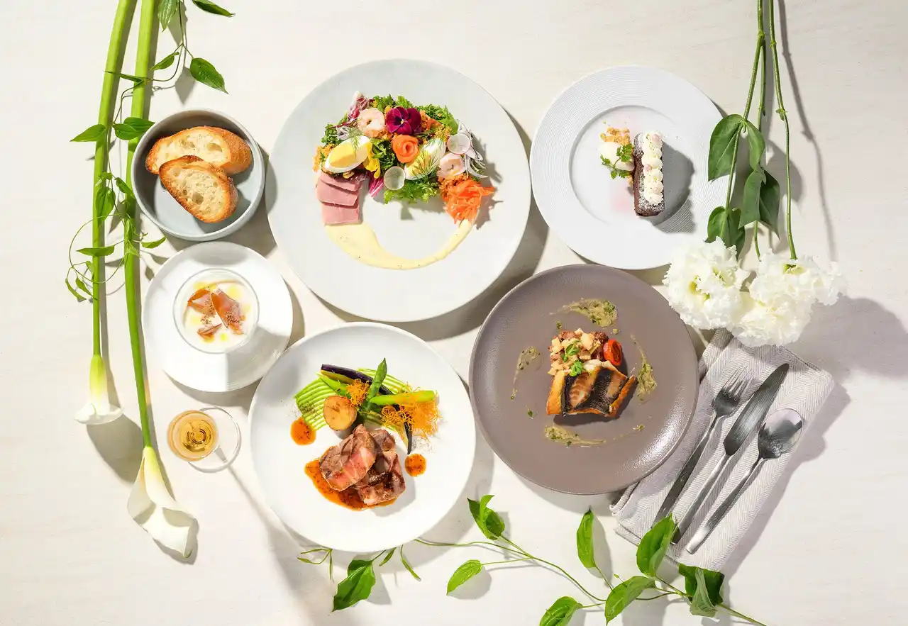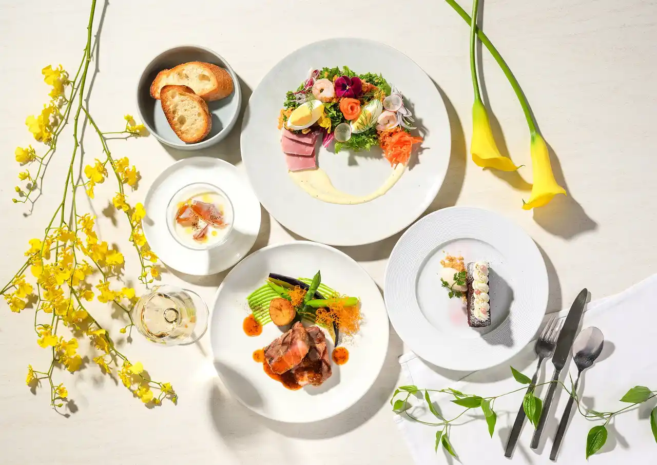 スイーツコレクションに加え、5月1日(金)からランチ・ディナーコースが新たな装いで登場いたします。季節ごとに旬の食材を取り入れたコースメニューを、今回は結婚式場併設カフェならではの祝祭感や多幸感を大切に、一皿ごとのビジュアルや演出により磨きをかけてご用意いたしました。素材の魅力を最大限に引き出した味わいとともに、祝福のシーンを想起させる華やかなビジュアルへと仕立て、大切な記念日にもふさわしい特別感あふれる内容へとブラッシュアップ。さらに、ディナーコースのデザートには、本フェアの象徴である「花嫁スイーツ」をご用意いたします。お食事の始まりからデザートの瞬間まで、祝祭感と多幸感に包まれる、心華やぐひとときをお楽しみください。 |
