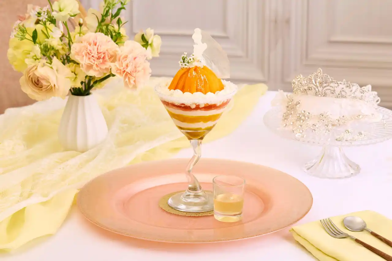 花嫁のドレスをイメージして仕立てた、季節限定のパフェが登場いたします。マンゴーとオレンジを花嫁のドレスのドレープに見立てて美しく重ね、ウェディングドレスの煌めきと華やかさを演出しました。グラスの中には、やさしい甘さのマスカルポーネクリームに、酸味の効いたトロピカルフルーツソース、マンゴーの果肉やマンゴーパッションソルベを重ね、ひと口ごとにフルーツの多彩な味わいが広がる、初夏にふさわしい軽やかで華やかな一品に仕上げました。