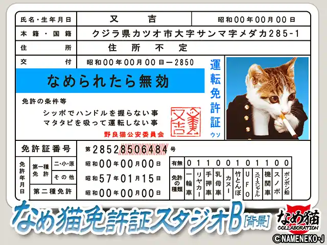 本コラボでは、たくさんのなめ猫のキャラクターたちが『単車の虎』の世界に登場します。なめ猫のグッズで大人気の「あの免許証」もゲーム内アイテムとして登場!この機会にぜひ『暴走列伝 単車の虎』をプレイしてください。 |