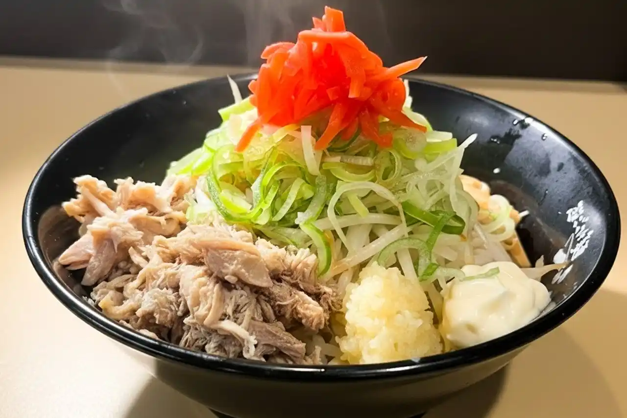 超ごってり麺ごっつならではのパンチを効かせた限定まぜそば。濃厚でコクのある特製ソースダレを太麺に絡めて楽しむ、ガツンと食べ応えのある一杯です。トッピングには、ほぐしチャーシュー、もやし、メンマ、青ネギ、刻みニンニクを合わせ、仕上げにマヨネーズを加えることでコクとまろやかさをプラス。さらに紅生姜の爽やかな酸味がアクセントとなり、濃厚ながらも食べ進めやすい味わいに。豪快に混ぜれば具材とタレが一体となり、ジャンクでクセになる旨味が広がります。 |