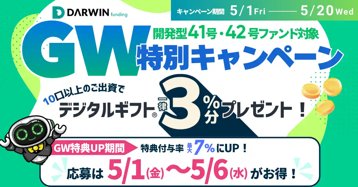 注意事項 ※本キャンペーンの特典は「DARWIN funding 開発型41号ファンドまたは42号ファンド」への確定された出資額に対して算出されます。 ※「出資」とは、ファンドへの応募後、抽選の結果当選し、期日までに入金が完了した出資を指します。 ※特典の付与期日は当該ファンドの運用開始後1ヶ月以内を予定しております。 ※デジタルギフト(R)は、株式会社デジタルプラスの商標です。 ※本キャンペーンは予告なく短縮・中止・終了する場合がございます。 ※当選後キャンセルまたは未入金の場合はキャンペーン対象外となります。 ※キャンペーンに関するお問い合わせは、お問い合わせフォームをご利用ください。 |