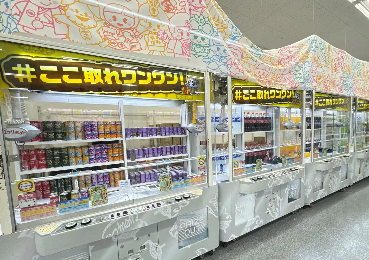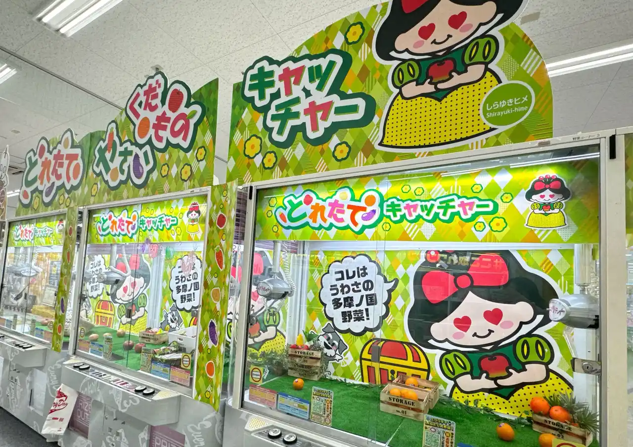 | テレビ放送では、食品や日用品をクレーンゲームで獲得できる様子が紹介され、「遊びながら生活費を節約できる新しいスタイル」として取り上げられました。店内には野菜・果物・飲料・日用品などが並び、 来店者がカートに景品を入れていく様子は、まるでスーパーでの買い物そのものです。 | |||||||||