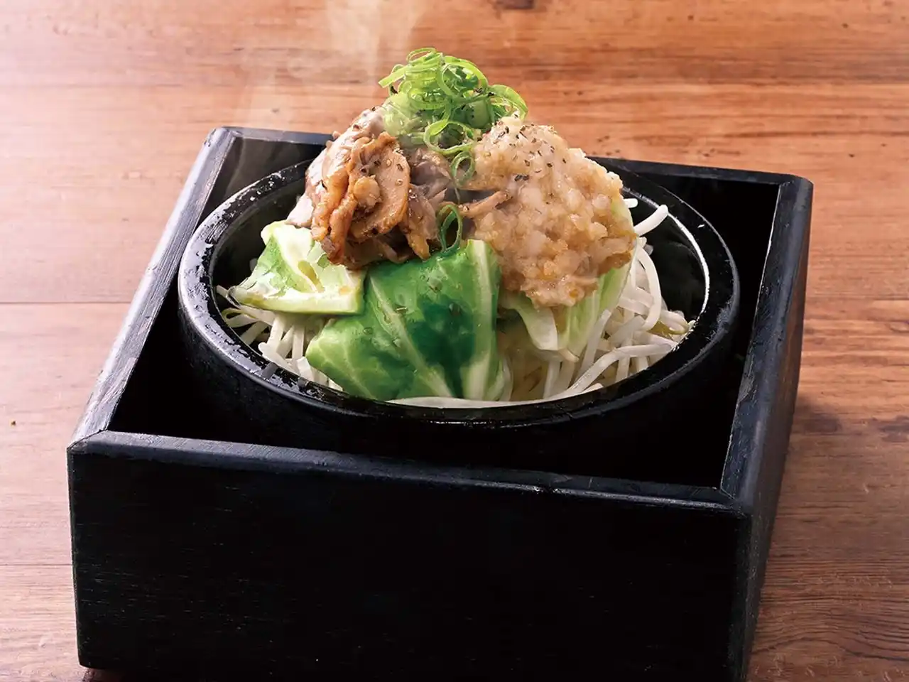 熱々の石鍋で仕上げる“ラーメンの具”にフィーチャーしたメニューです。パンチの効いた”背脂にんにく”は、ガッツリ濃い味でお酒のお供にも最高です!また、プラス108円(税込)で、”追いラーメン”又は”追い飯”ができ、〆メニューに変身可能です。 |