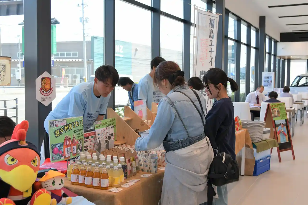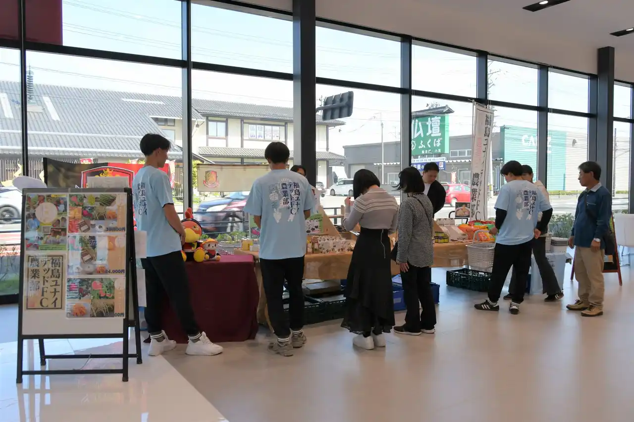 その一環として、2026年4月26日(日)福島日産 福島鎌田店において、福島ユナイテッドFC所属選手が参加する、農業部による出張販売イベントを実施いたしました。当日は、選手自らが店頭に立ち、福島県産品の魅力を来場者へ直接届けることで、店舗を拠点とした新たな接点創出と、地域産業の認知向上に貢献いたしました。 |