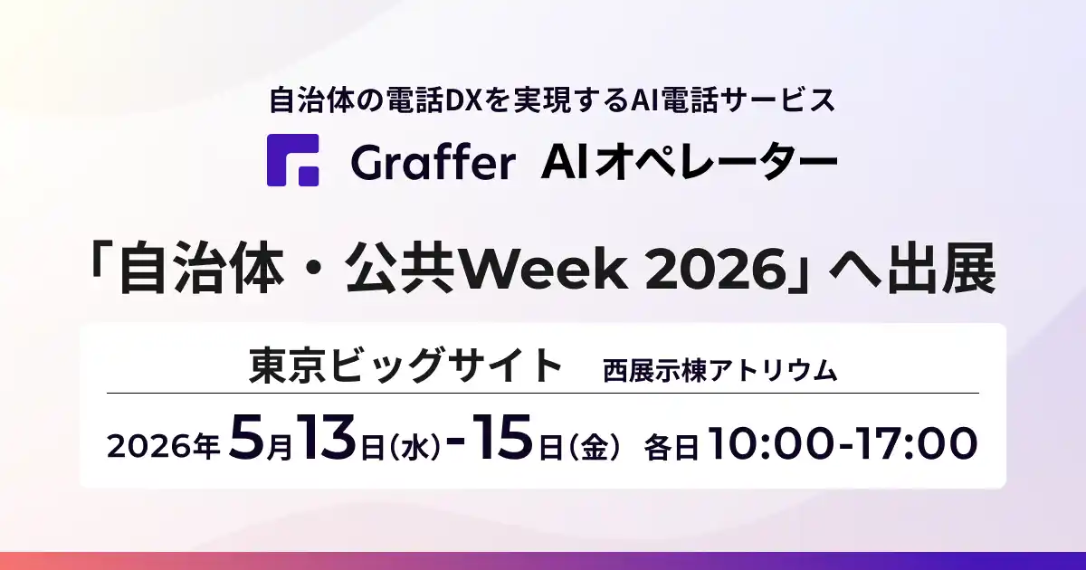 自治体の業務変革を実現する株式会社グラファー(本社:東京都渋谷区、代表取締役:石井大地、以下「当社」)は、2026年5月13日(水)~15日(金)に東京ビッグサイトで開催される「自治体・公共Week 2026」に出展します。当社ブースでは、「電話がつながらないという住民の不満を解消したい」「電話対応の業務負担を減らしつつ住民サービスの質を向上させたい」といった課題を持つ自治体に向けた解決策を提示。メイン展示として、住民の自然な発話を理解し、自治体ごとの参照情報(ナレッジ)をもとに回答するAI電話サービス「Graffer AIオペレーター」を紹介します。ブース内では、サービスのデモ体験や、自治体への導入・活用に関する個別相談会を実施します。 |
