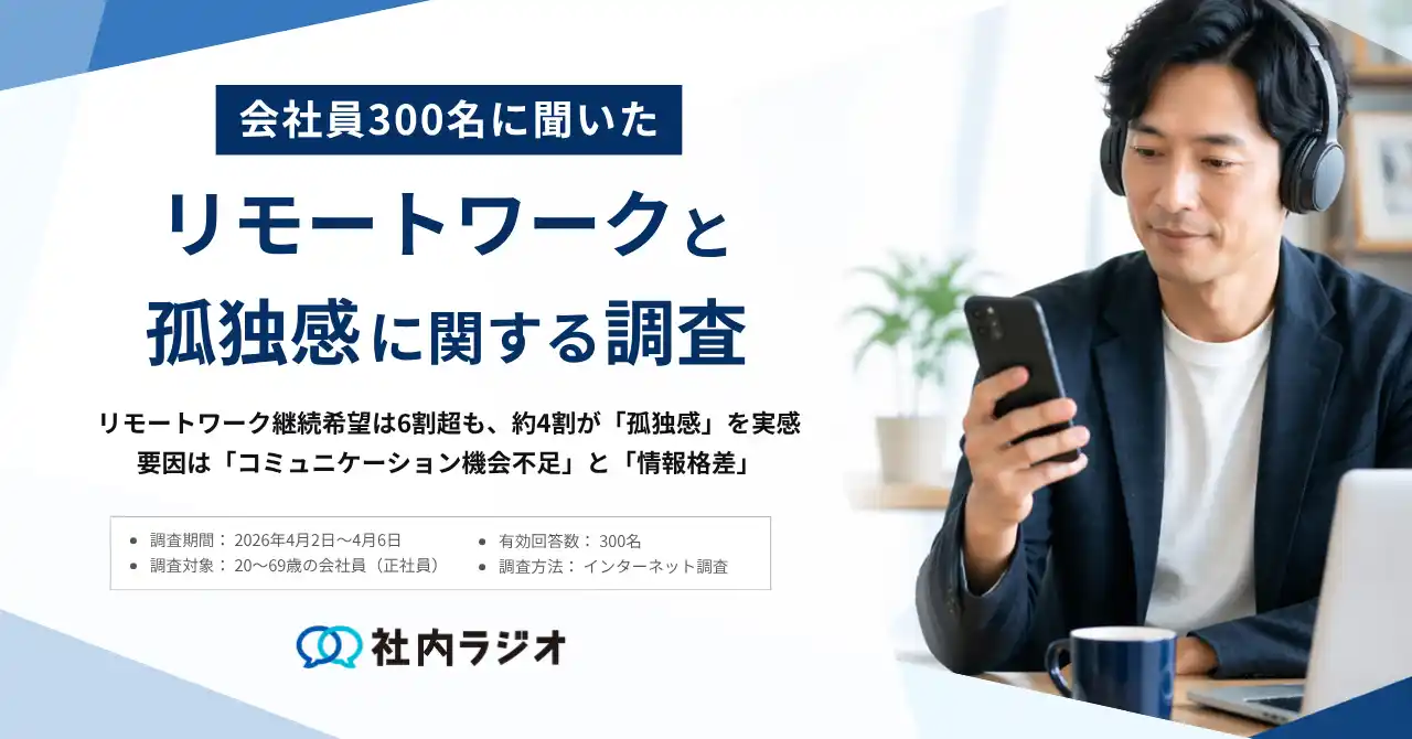 組織をつなぐ音声コンテンツ「社内ラジオ」を提供する株式会社オトバンク(本社:東京都文京区、代表取締役社長:久保田裕也、以下「オトバンク」)は、週3日以上リモートワークを行う20~69歳の会社員300名を対象に、「リモートワークと孤独感」に関する調査を実施しました。 |