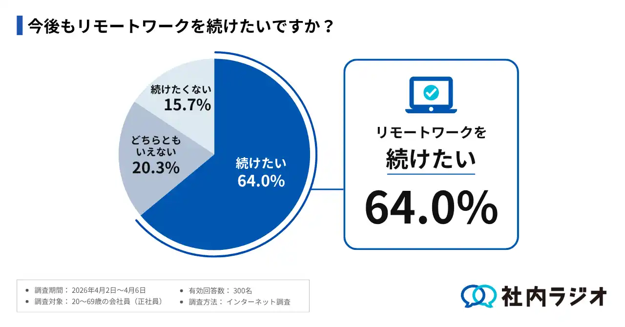 「今後もリモートワークを続けたいか」という問いに対し、64.0%が「続けたい」と回答。リモートワークは多くの人に支持されていることが明らかになりました。 |