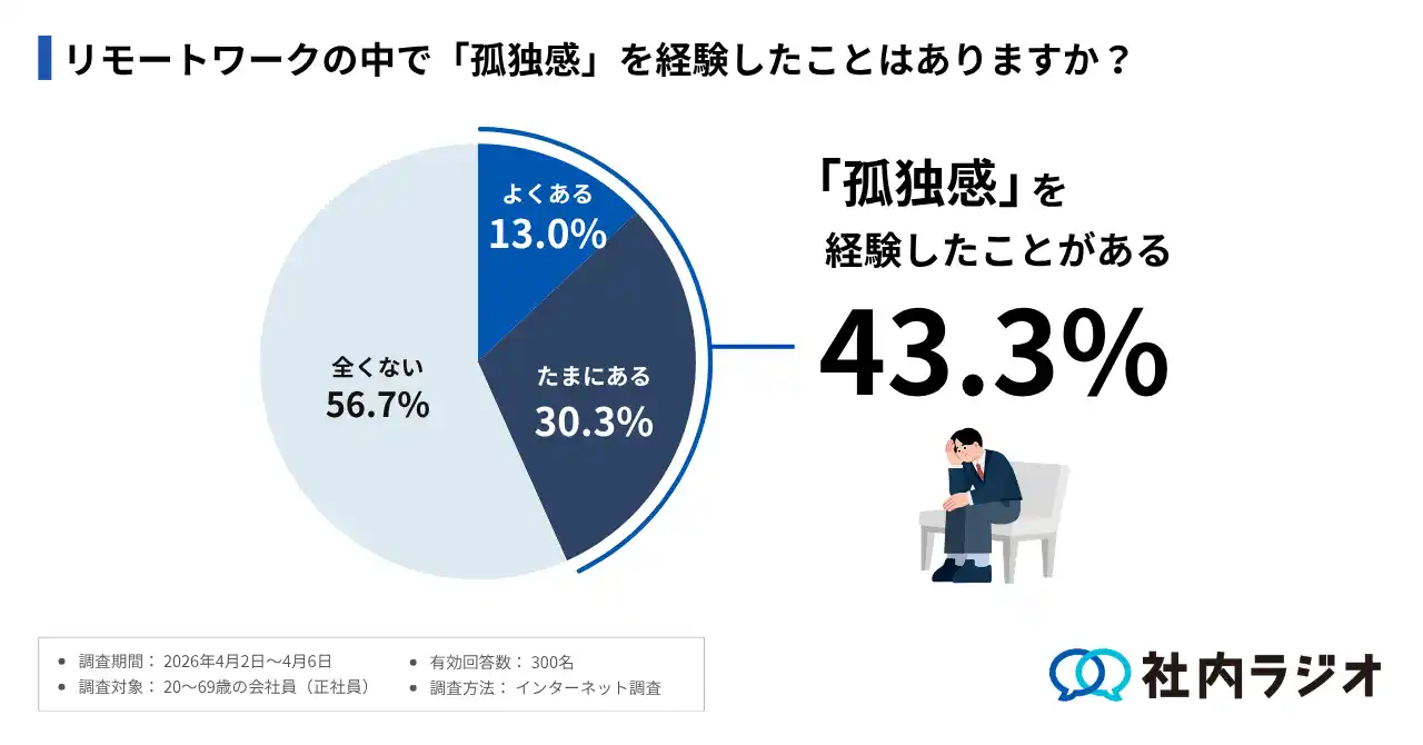 働き方としてはリモートワークが定着しているものの、約4割が心理的な孤立を感じている実態が浮き彫りになりました。 |