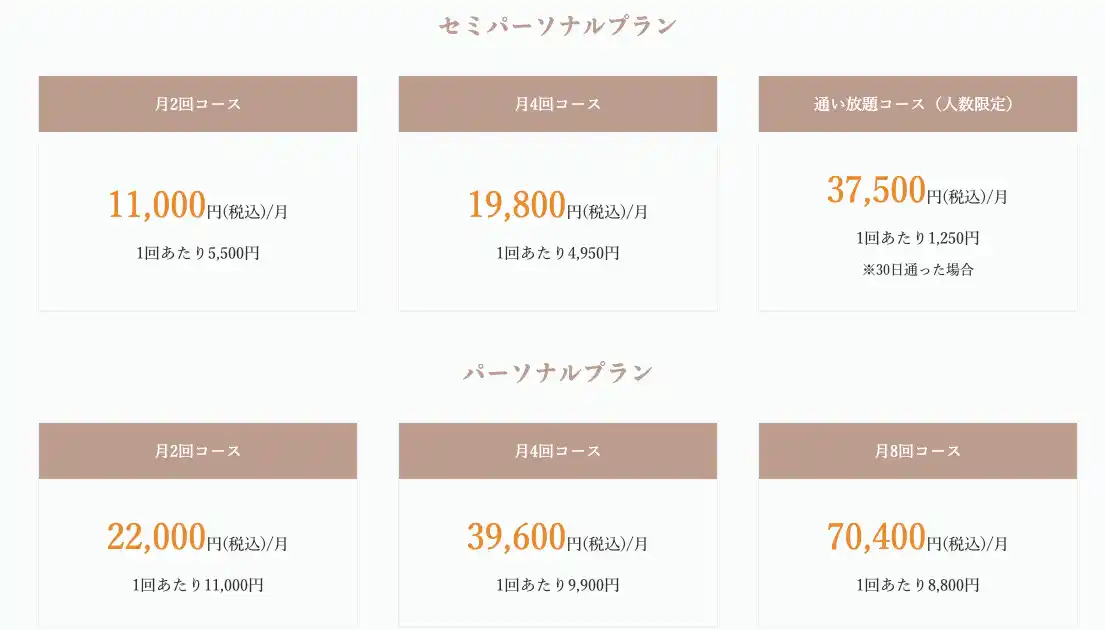インストラクターとマンツーマンで行う完全個別のレッスンです。身体の状態や目標に合わせたオーダーメイドのプログラムを組むため、特定の部位を集中的に改善したい方や、自分のペースでじっくり取り組みたい方に適しています。セミパーソナルと併用することも可能で、普段はセミパーソナルで通いながら、月に1回だけパーソナルで重点的にケアするといった使い分けもできます。 |