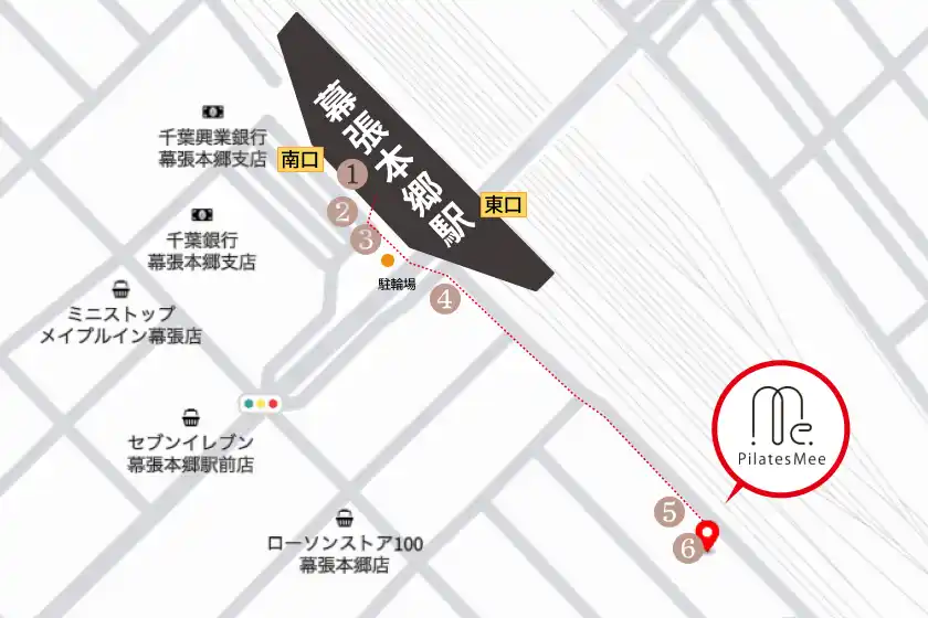 Pilates Meeは全国に120店舗以上を展開しており、会員であればどの店舗でもレッスンを受けることができます。幕張本郷店の近隣には、総武線で1駅の新検見川店をはじめ、東船橋店や千葉中央店など千葉県内だけでも複数の店舗があるため、お出かけ先や勤務先の近くなど、その日の予定に合わせて柔軟にスタジオを選べるのも大きな魅力です。 |