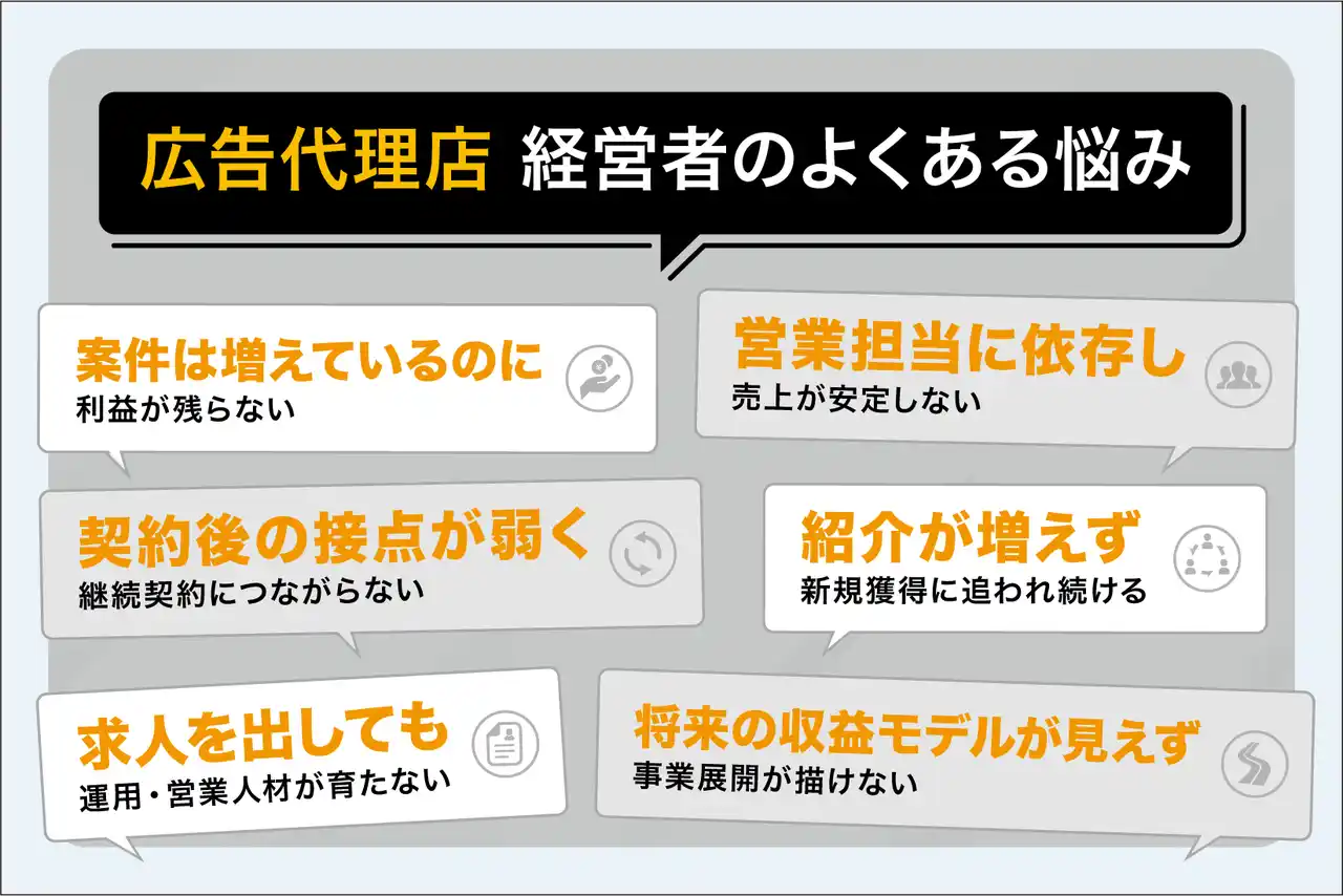 しかし多くの代理店では、これらの判断基準が属人化しており、 特定の営業担当や運用者、経営者に依存する構造や、 日々の案件対応に追われ経営判断が後回しになっている状態が見られます。 |