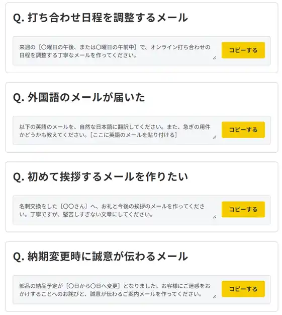 ・若手社員とのコミュニケーション改善 ・角が立ちにくい依頼文の作成 ・取引先向けメール文案の作成 ・業務マニュアルのたたき台作成 |