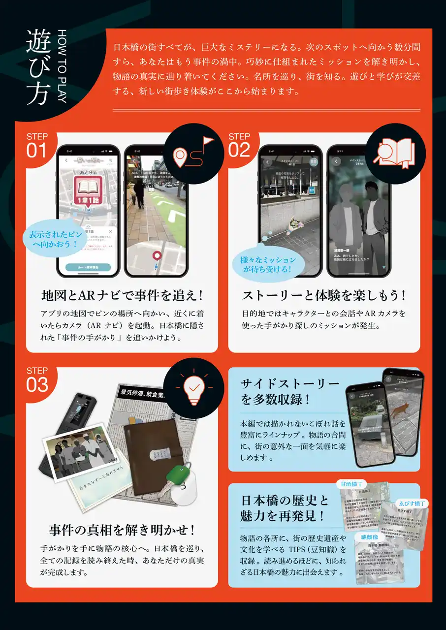 | 日本橋で起こった事件の謎を解くために、日本橋の名所などのスポットを巡ってシナリオを入手し、物語を読み進めて推理をしながら、日本橋周辺を探訪していきます。スマートフォンのカメラをかざして楽しむARや位置情報の技術を用いて、物語の世界と現実の街並みがリンクする没入感のある街歩き体験を提供します。 | ||||||||||