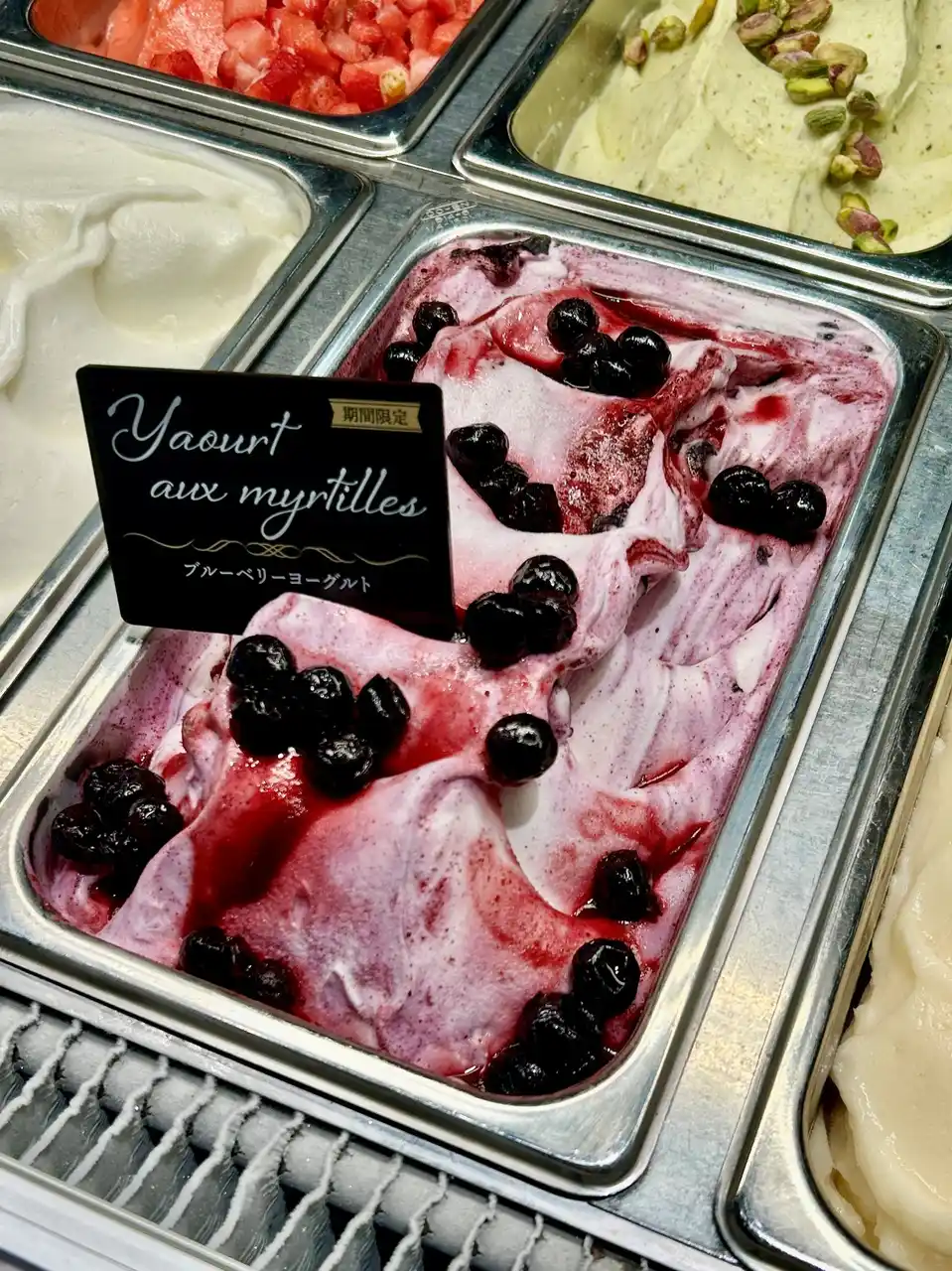 すっきりとした酸味のヨーグルトジェラートに甘く香るブルーベリーのコンフィチュールを混ぜ込んだ |