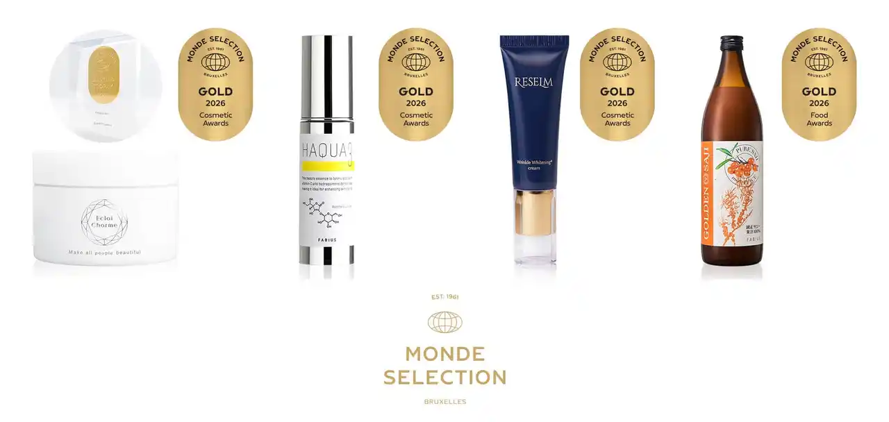 「すべての人を美しく」を掲げて化粧品・健康食品を展開するファビウス株式会社(本社:東京都渋谷区、代表取締役社長:濱崎恵子)は、厳正かつ公正な審査プロセスで知られ、世界的な品質評価指標である「モンドセレクション2026」において、「エクラシャルム」「ハクアスリー」「リセルム」「ゴールデンサジー(R)(純正サジー)」の4商品が同時に金賞を受賞いたしました。 |