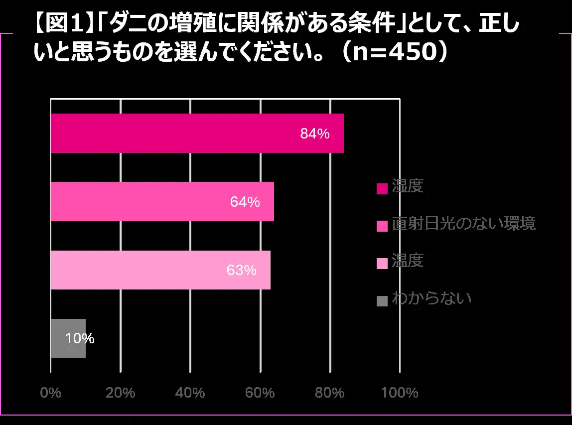 「ダニの増殖に関係がある条件」として、84%が「湿度」と回答しており、多くの人が湿度とダニの関係性そのものは認識していることがわかりました。【図1】 |