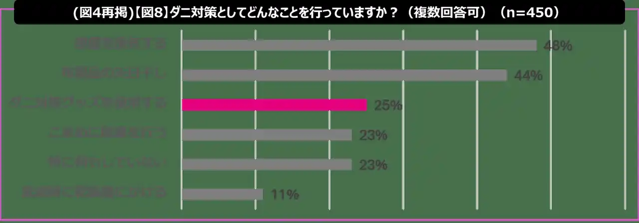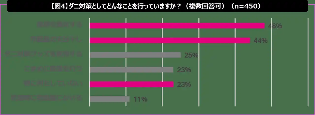 「部屋の換気」48%、「布製品の天日干し」44%が上位となり、手軽で昔ながらの効果が薄い方法に偏っている傾向が見られました。