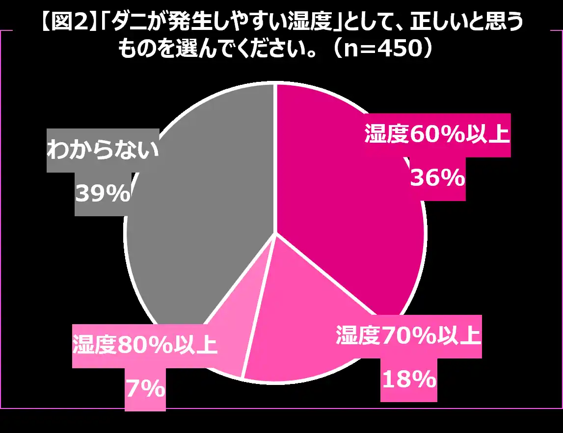 一方で、ダニが発生しやすい湿度の目安については「わからない」と回答した人が最多となり、ダニが大量発生する危険ラインとされる「湿度60%以上」を正しく理解している人は限られていることが明らかになりました。【図2】 |