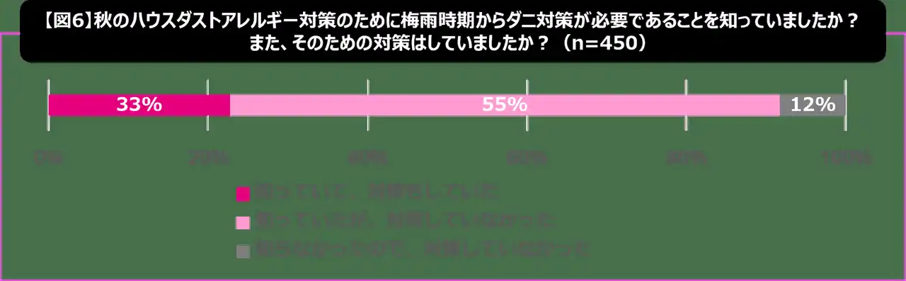 さらに、秋のハウスダスト対策として重要とされる“梅雨時期からのダニ対策”については、対策を実施していない人が67%にのぼる結果となりました。【図6】 |