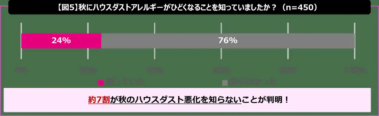 秋にハウスダストアレルギーが悪化しやすいことについて、「知らない」と回答した人が76%にのぼり、多くの人が秋にアレルギー症状が強まる可能性を認識していない実態が明らかになりました。【図5】 |